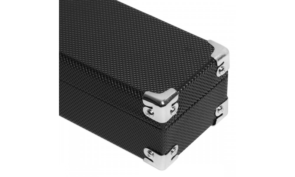 Кейс изготовлен из МДФ, современного материала, обладающего большой прочностью и износостойкостью. Углы кейса для предотвращения повреждений защищены металлическими накладками. Крышка держится на трех металлических петлях, при закрытии фиксируется двумя металлическими замками. Для транспортировки кейс снабжен прочной и удобной выдвижной рукояткой.